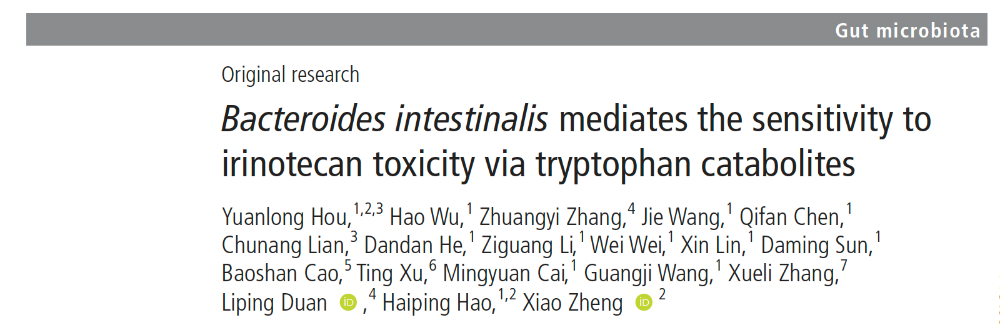2025年9月3日,我学会副理事长、中国药科大学郝海平/郑啸教授团队联合北京大学第三医院消化科段丽萍教授团队在消化道领域国际期刊Gut发表了题为:Bacteroides intestinalis mediates the sensitivity to irinotecan toxicity via tryptophan catabolites的研究性论文,通过多中心队列分析结合小鼠模型,揭示化疗后富集的Bacteroides intestinalis(B.intestinalis)通过其代谢产物吲哚-3-乙酸(IAA)加剧伊立替康诱导的肠上皮损伤,为其个体化毒性预测提供新策略。
