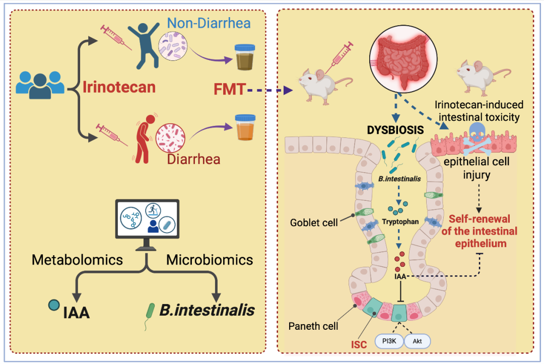 郝海平/郑啸教授等团队前瞻性收集48例接受伊立替康治疗的结直肠癌患者基线及治疗期粪便样本,通过16S rRNA测序和宏基因组分析发现腹泻患者肠道内拟杆菌属(尤其是B.intestinalis)显著富集,且该差异在治疗后被进一步放大。将患者基线菌群移植至小鼠的实验证实,腹泻易感性可通过菌群传递。机制上,伊立替康促进B. intestinalis扩增,其代谢色氨酸产生的IAA在腹泻患者粪便中明显升高,而其他菌株(如B. uniformis)因缺乏IAA合成能力则无此效应。利用合成生物学手段构建的IAA高产菌株可模拟B. intestinalis对肠毒性的加剧作用。肠类器官实验进一步证明,IAA能增强化疗药物对肠道干细胞的损伤。转录组分析揭示IAA通过抑制PI3K-Akt信号通路,阻碍肠上皮修复能力,而Akt激动剂SC79可逆转IAA对干细胞增殖的抑制作用。在动物实验中,补充IAA显著加重肠道组织病理损伤。值得注意的是,B. intestinalis定植或IAA补充均不影响肠道SN-38浓度,表明其独立于经典的β-GUS-SN38代谢物毒性假说。