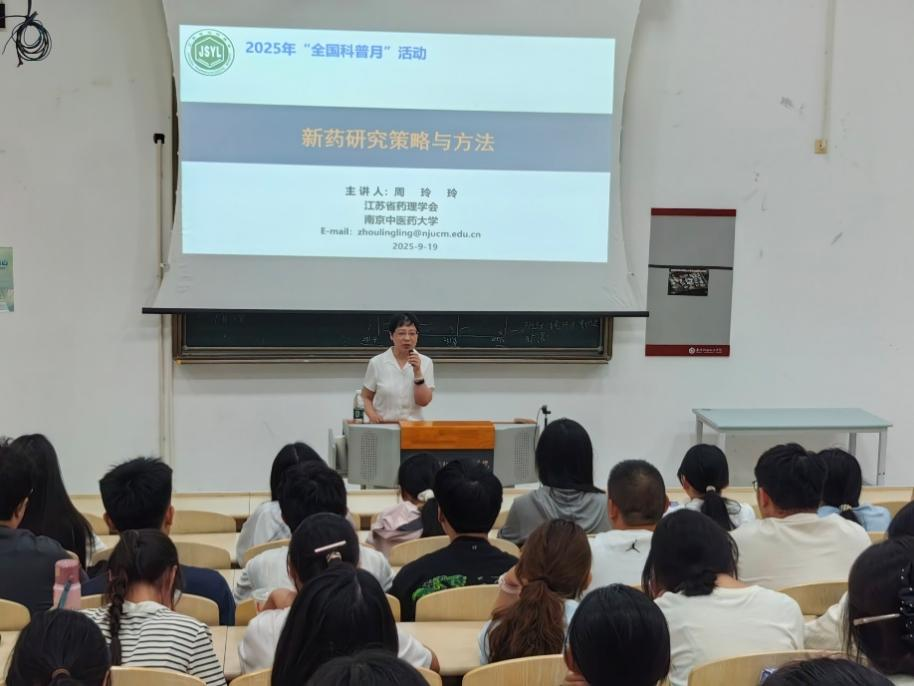 根据全民科学素质纲要实施工作办公室《关于广泛开展首个“全国科普月”活动的通知》精神,江苏省药理学会积极落实开展“全国科普月”活动。 2025 年9月19日下午14时,省药理学会副秘书长、南京中医药大学周玲玲教授在泰州职业技术学院综合教学楼218教室开展了主题为“新药研究策略与方法”的讲座,该校100余名师生参加了讲座。